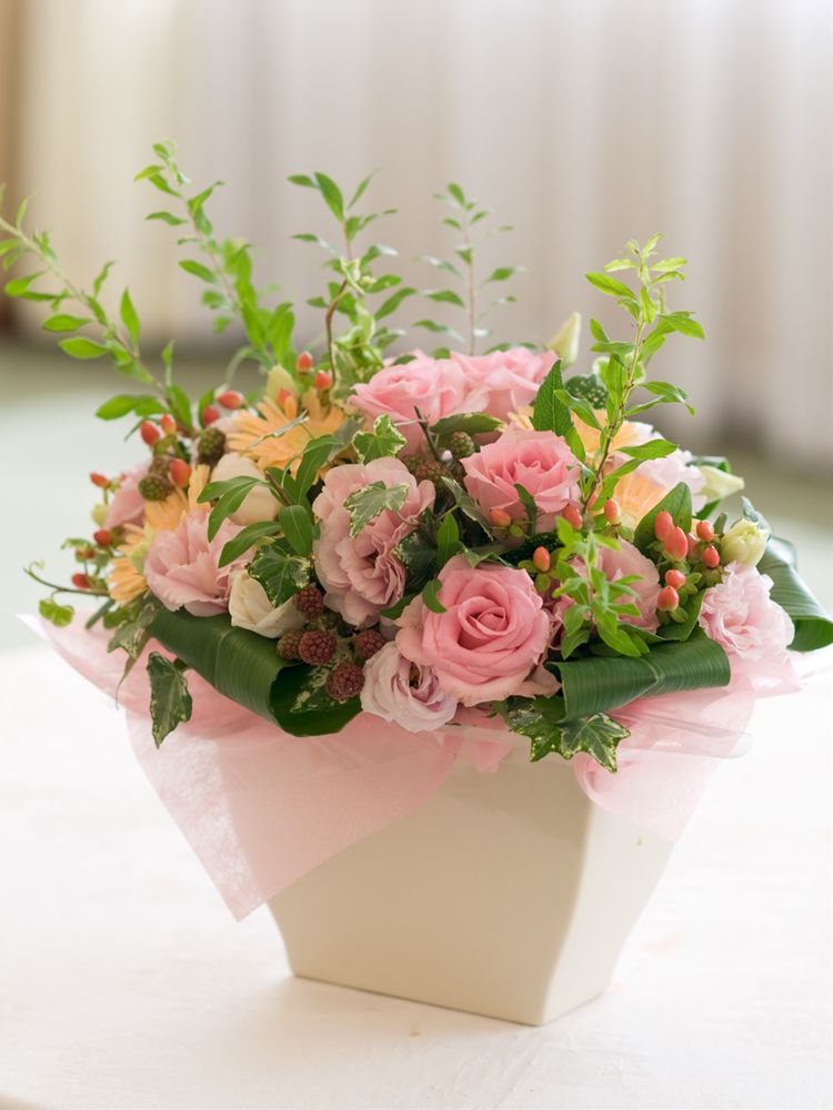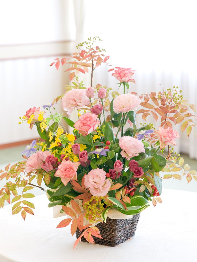 シナモンが秋の雰囲気をとてもよく醸し出していて、少し控えめなピンクのバラが、かわいらしくもあり大人っぽさも合わせ持っていて、どの年代の方にも、贈りやすいと思う。